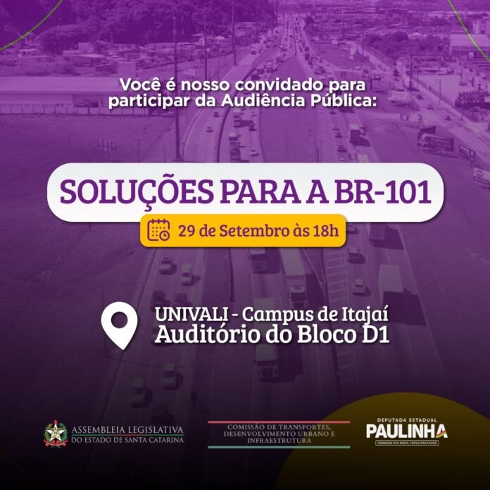 A Assembleia Legislativa do Estado de Santa Catarina tem a honra de convidar para participar da Audiência Pública com o objetivo de debater a eficiência, os desafios e as possibilidades de revisão e melhoria do contrato de concessão da BR-101 em Santa Catarina, a realizar-se: