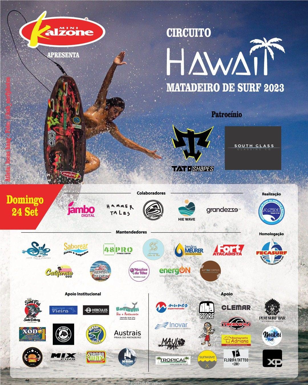 Vai começar o Circuito Hawaii Matadeiro 2023, apresentado pelo Mini Kalzone, etapa válida pelo circuito da Associação de Surf do Matadeiro(ASM). A competição terá a duração de um dia, e após uma reunião feita no meio desta semana, a diretoria definiu para domingo (24 de setembro) a realização da prova.