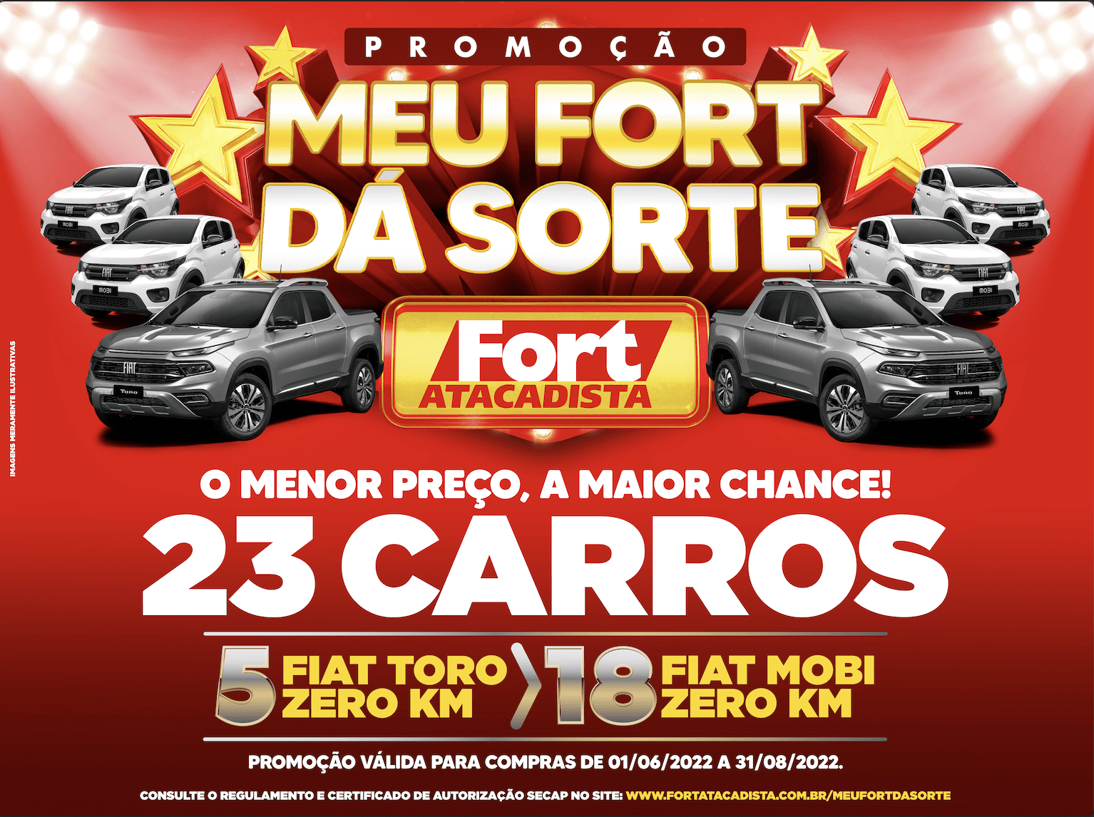 Após fazer história no ano passado com quase meio milhão de participantes e 14 milhões de cupons gerados, a campanha “Meu Fort da Sorte” está de volta a partir desta quarta-feira, 1º de junho, em todas as lojas do Fort Atacadista no país, presente nos estados de Santa Catarina, Mato Grosso, Mato Grosso do Sul, São Paulo e no Distrito Federal. A segunda edição da campanha promocional será ainda maior, sorteando 23 automóveis zero quilômetro – cinco Fiat Toro e 18 Fiat Mobi – e prêmios diários em créditos no Vuon Card, até o dia 31 de agosto. Para participar basta realizar compras a partir de R$ 100 em qualquer uma das 48 unidades do Fort Atacadista e cadastrar os cupons no site oficial: www.meufortdasorte.com.br.