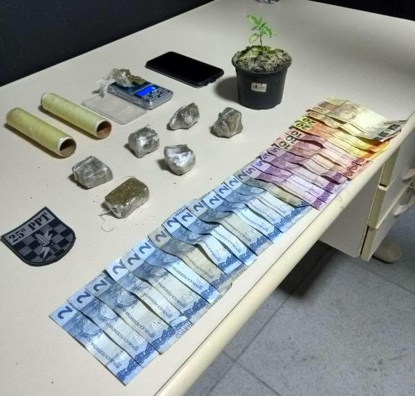 No imóvel, os policiais confirmaram a denúncia. O rapaz foi preso junto com 250g de maconha em porções separadas para a venda, além de um pé de maconha, dinheiro, balança de precisão e materiais destinados à embalagem da droga.