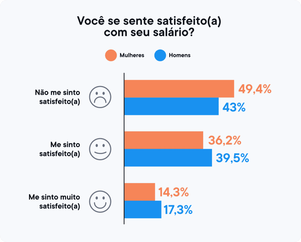 O dado também está alinhado com a satisfação salarial. Se 17% dos homens respondentes do estudo disseram que se sentem muito satisfeitos com seus salários atuais, a porcentagem é de 14% para a satisfação das mulheres. 40% dos homens afirmaram que estão satisfeitos com sua remuneração, enquanto para as mulheres a satisfação fica em 36%. Já para a relação de insatisfação sobre o salário, as mulheres ficam à frente, com 49% indicando que não estão satisfeitas com seus salários, enquanto este número cai para 43% quando em relação aos homens.