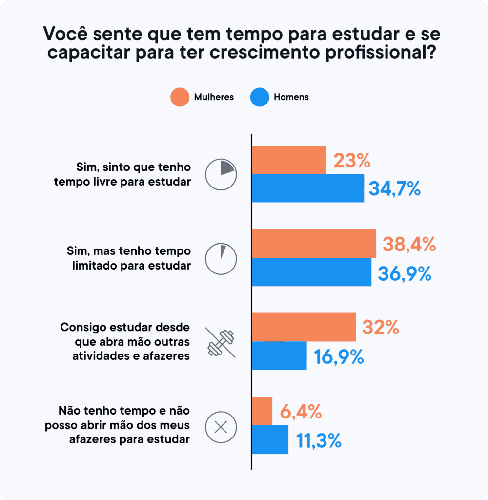 Em relação à capacitação profissional, foi perguntado aos entrevistados se eles sentem que têm tempo para estudar e se qualificar para ter crescimento profissional. Enquanto 35% dos homens disseram que têm tempo livre para estudar, apenas 23% das mulheres possuem esse tempo disponível. Em contrapartida, 32% das mulheres afirmaram que conseguem estudar apenas se abrirem mão de outras atividades e afazeres, e esse número cai para 17% em relação aos homens.