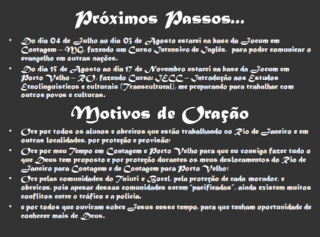 Enfim, iremos compartilhar com vocês um material do missionário Felipe Luiz de Oliveira, que está instituindo um trabalho de evangelização no “Morro do Tuiuti”, favela do Rio de Janeiro entre outros, confira: