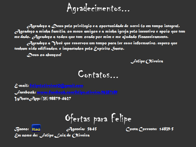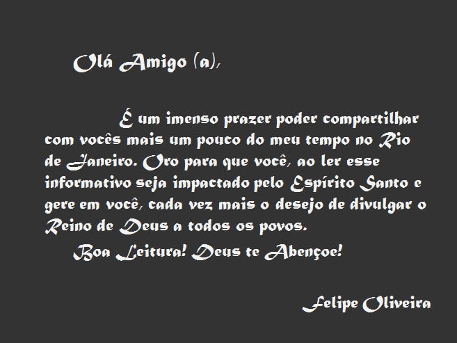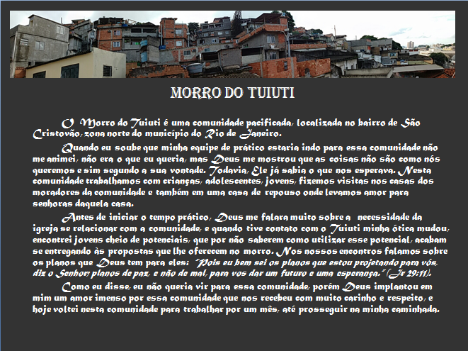 Enfim, iremos compartilhar com vocês um material do missionário Felipe Luiz de Oliveira, que está instituindo um trabalho de evangelização no “Morro do Tuiuti”, favela do Rio de Janeiro entre outros, confira: