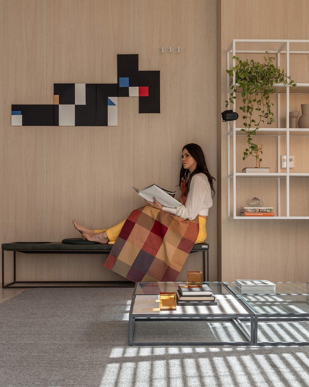 A escrivaninha do escritório, feita de madeira certificada, mostra imagens de tecelãs, designers, fotógrafas e arquitetas, entre elas Gunta Stölzl, Lilly Reich, Anni Albers e Friedl Dicker ofuscadas pela história que protagonizaram. Ao resgatar a memória destas mulheres, Natália traz a força feminina para todo o seu ambiente que é informativo, leve e transparente, priorizando as formas essenciais e as cores puras, integrando a arte para fugir do tradicional. O dormitório integra sala de estar, escrivaninha e sala de banho, favorecendo a tranquilidade e o conforto.