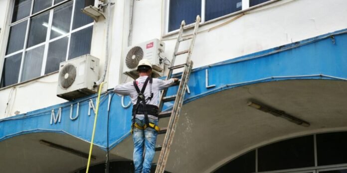 A reforma da sede da Prefeitura de Balneário Camboriú está em andamento, com ritmo acelerado. Nesta primeira fase, está sendo realizada a limpeza da estrutura externa e reparos nas instalações elétricas e nas tubulações dos aparelhos de ar-condicionado. Na sequência, será iniciada a pintura da fachada.