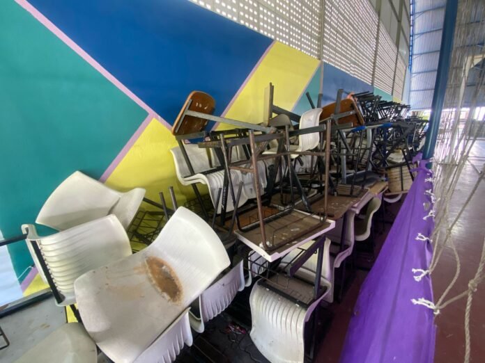 Os entulhos estão sendo destinados ao aterro sanitário, e os bens identificados com patrimônio estão sendo levados para a sede da Secretaria de Educação, onde serão organizados e terão a devida baixa patrimonial antes da destinação final.