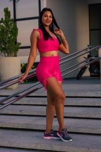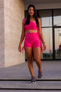 A loja que contratou a professora e musa fitness tem o foco em peças confortáveis para usar durante atividades físicas, como malhação em academia. Roseane usou três looks diferentes: um rosa, um azul claro e um escuro.