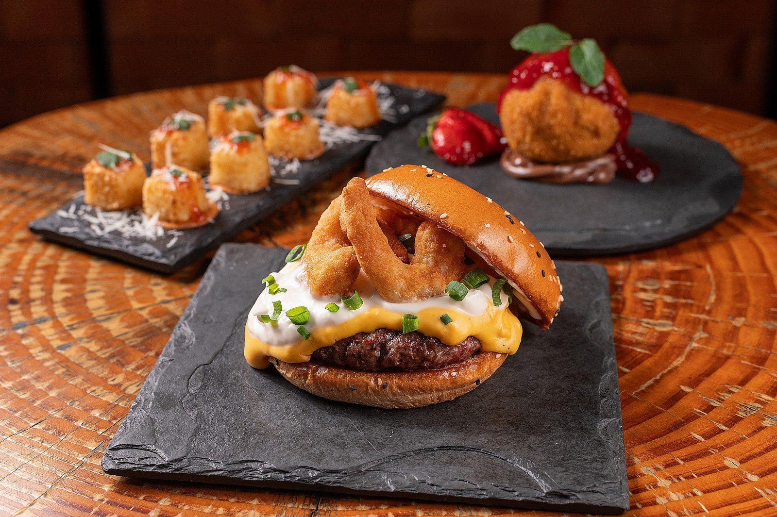 Prato Principal: pão brioche selado na manteiga, blend bovino da casa 140g, creme de queijo colonial e aipim palha. Servido com cebolinha verde e maionese de limão cravo;